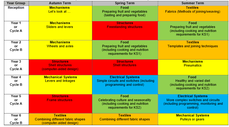 Design and Technology is taught as a skill-based subject that is linked to the wider curriculum. Lessons delivered to each year group focus on 3 topics and a separate set of skills throughout the year. Each half term, Design and Technology and Art alternate; projects are delivered as either a block of work or over a series of lessons or consecutive weeks. The time dedicated to Design and Technology ensures that each topic can be delivered to a high standard and children can create products with a purpose.